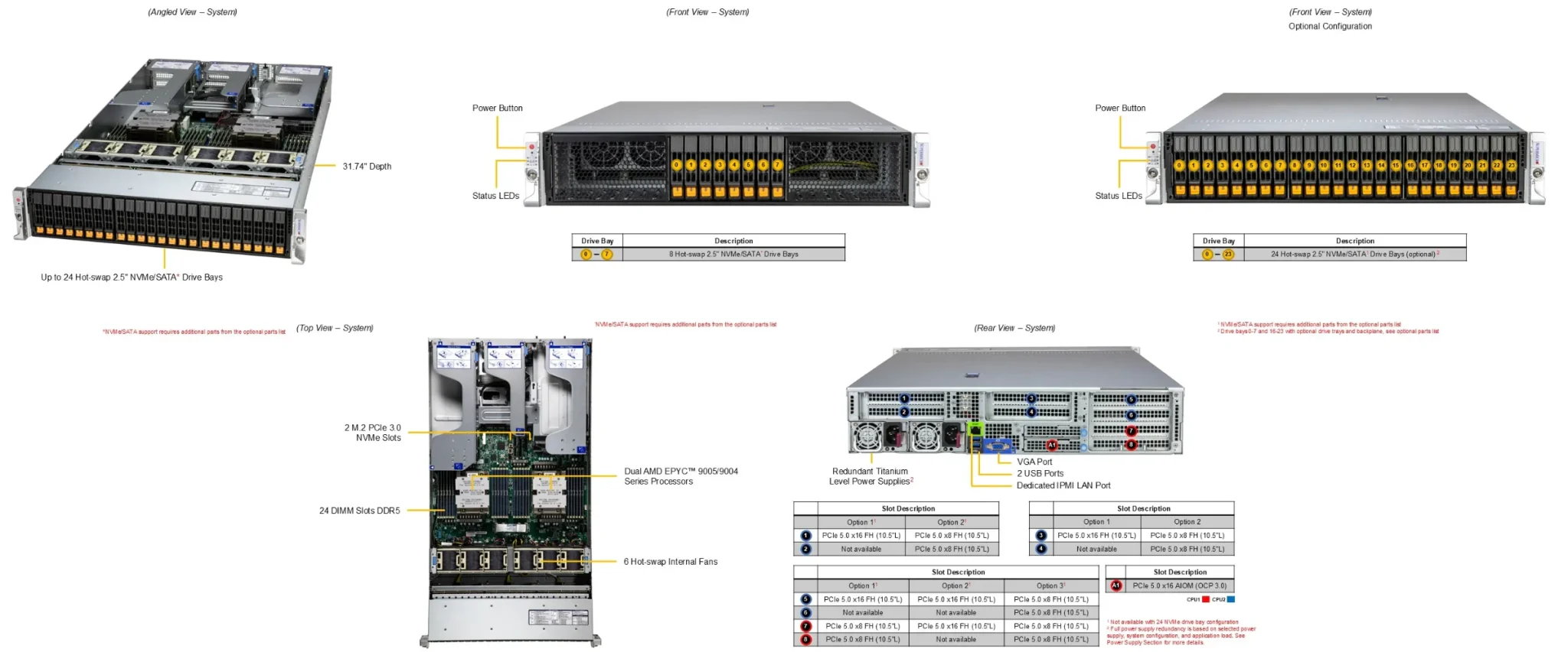 • Up to 24 front hot-swap 2.5″ NVMe/SATA drive bays
