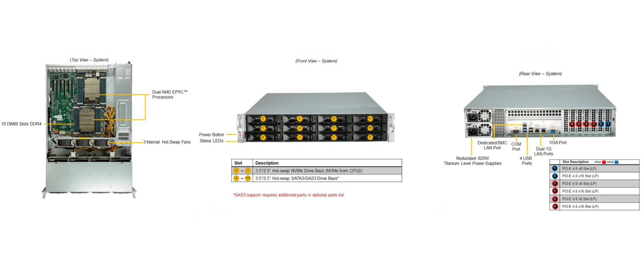 | HDD Backplane | Supports 12 SATA3 or 12 SAS3 or 4 NVMe | |