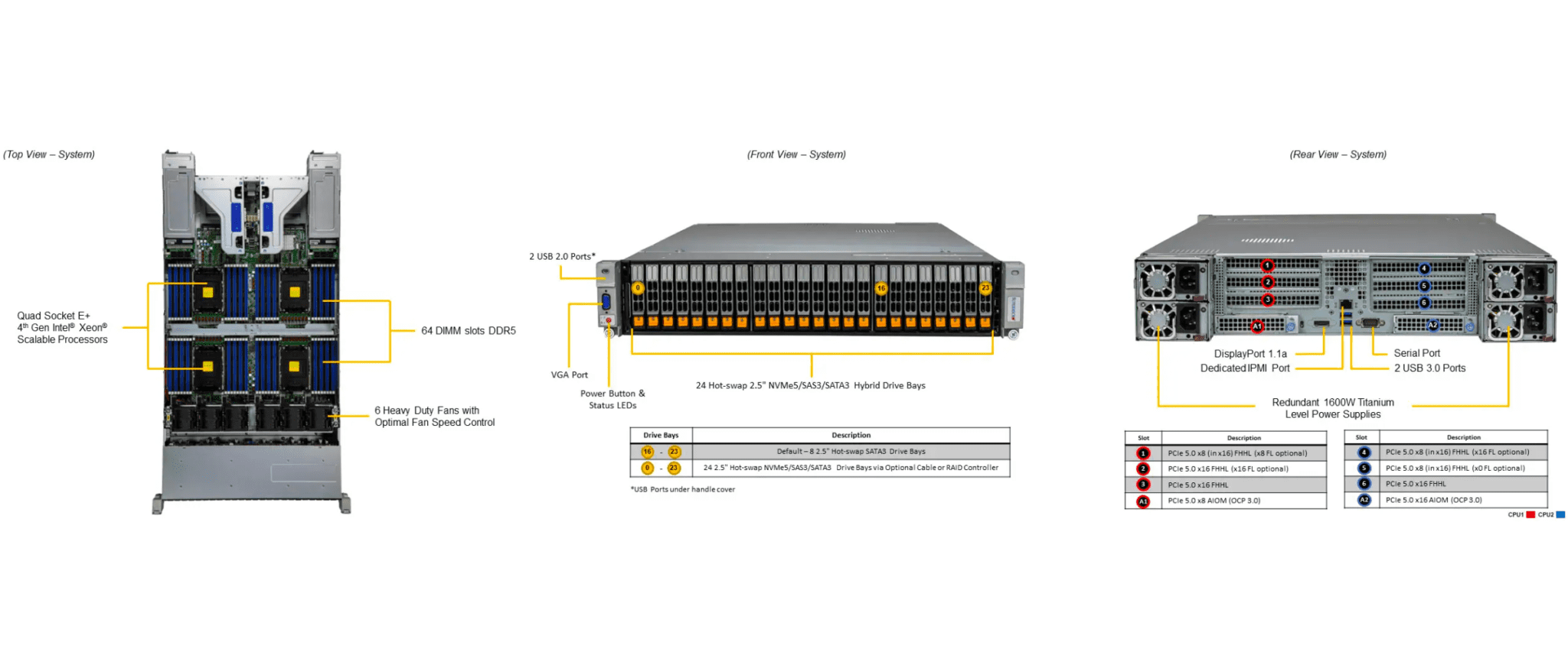 | Hot-swap | 24x 2.5″ hot-swap NVMe/SAS3/SATA3 drive bays (24x 2.5″ NVMe hybrid)(Default 8x SATA3 drive bays. NVMe, SATA, or SAS support requires additional parts. Please see the Optional Parts list.) | |