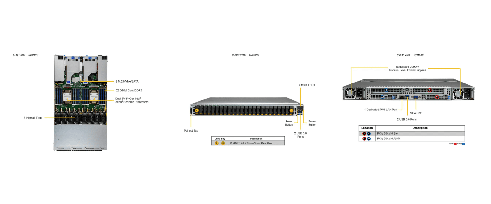 | Hot-swap | 24x E1.S Hot-swap NVMe (9.5mm or 15mm) drive slots |