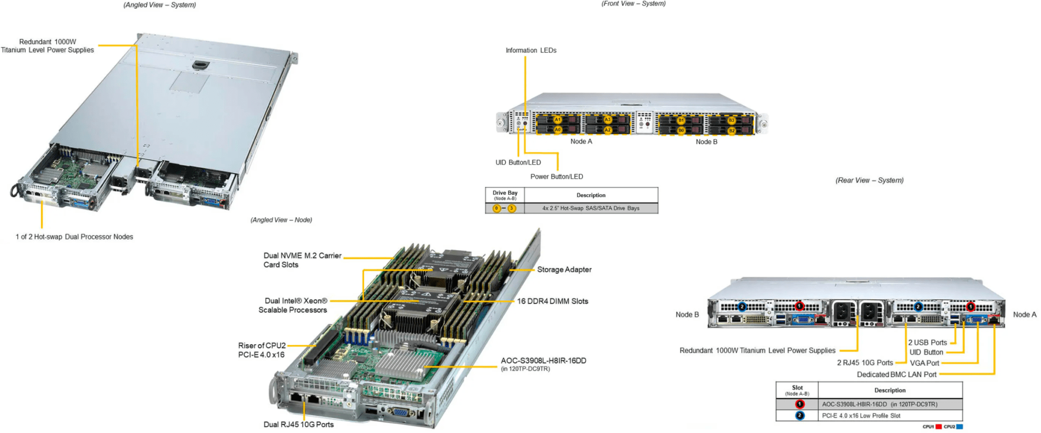 Broadcom® 3908 SAS (12Gbps); 4 slots per node; RAID 0, 1, 5, 6, 10 support.