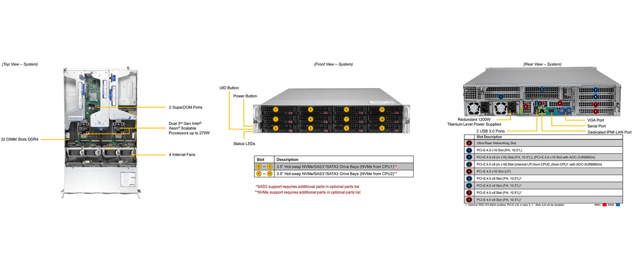 | Hot-swap | 12x 3.5″ hot-swap NVMe/SATA/SAS drive bays (12x 2.5″ NVMe hybrid)(SAS/NVMe support requires additional parts. Please see the Optional Parts list.) | |